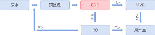 電鍍廢水由于其水質復雜,各類重金屬、COD含量較高,一直是膜濃縮工藝中的難點,采用均相膜電滲析裝置有效的解決了此問題,原水經沉降、氧化、超濾預處理后進入電滲析濃縮, 達到12%后進入MVR蒸發,淡水經反滲透處理后回用,電鍍廢水得到有效處理,達到近零排放。
